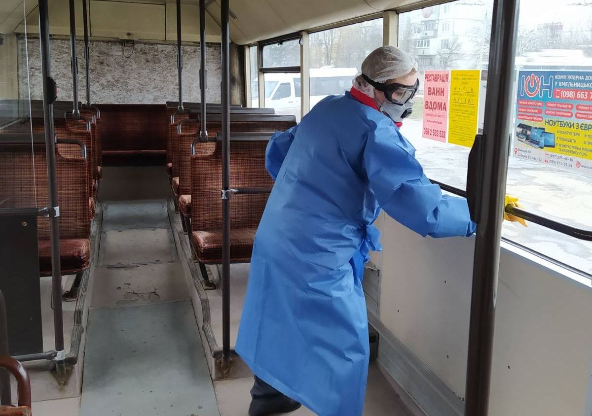 З 26 лютого у Хмельницькому почали дезінфікувати комунальний транспорт. В тролейбусах та автобусах здійснюють вологе прибирання, протирають поручні, спинки крісел хлорвмісними або спиртовмісними засобами. Громадський транспорт та зупинки Хмельницького додатково обробляють дезінфікуючими засобами. Окрім тролейбусів, знезаражують усі 124 зупинки та 5 диспетчерських пунктів. Комунальне підприємство «Електротранс» закупило маски та рукавички для водіїв і кондукторів. Крім того, 30 захисних костюмів, 200 окулярів та 100 респіраторів надали представники християнської місії «Допомога».